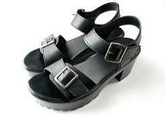 厚底ですが、高低差がないので足に負担が少なく楽です。足首部分のベルトはマジックテープ留めになっています。 |